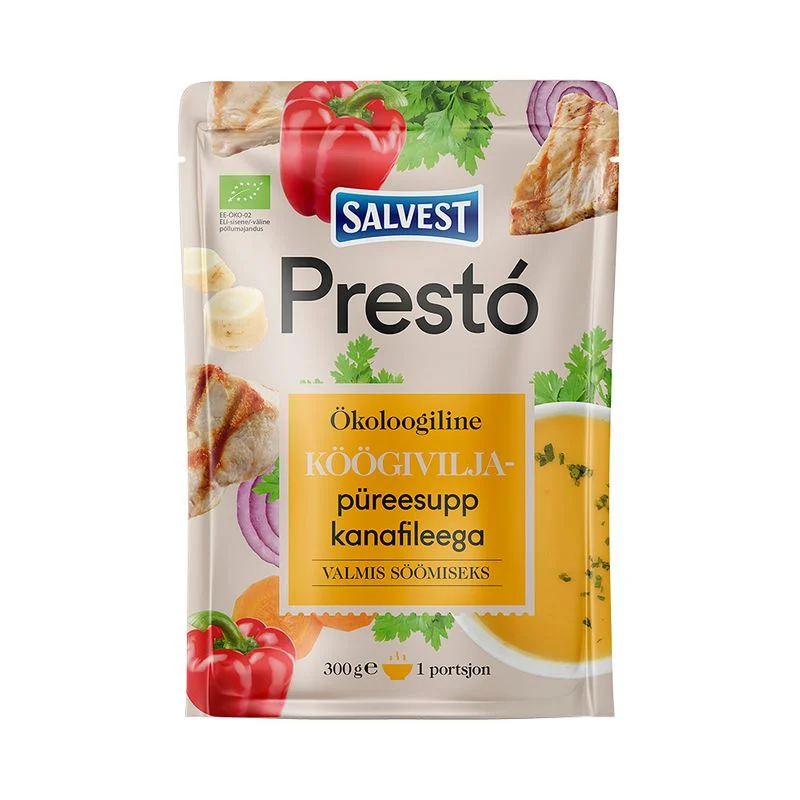 SALVEST PRESTO KÖÖGIVILJAPÜREESUPP KANAFILEEGA 300GRTootekood: 4740073073773 – + tk 2,10€* hinnale lisandub käibemaksPakendi kogus: 5